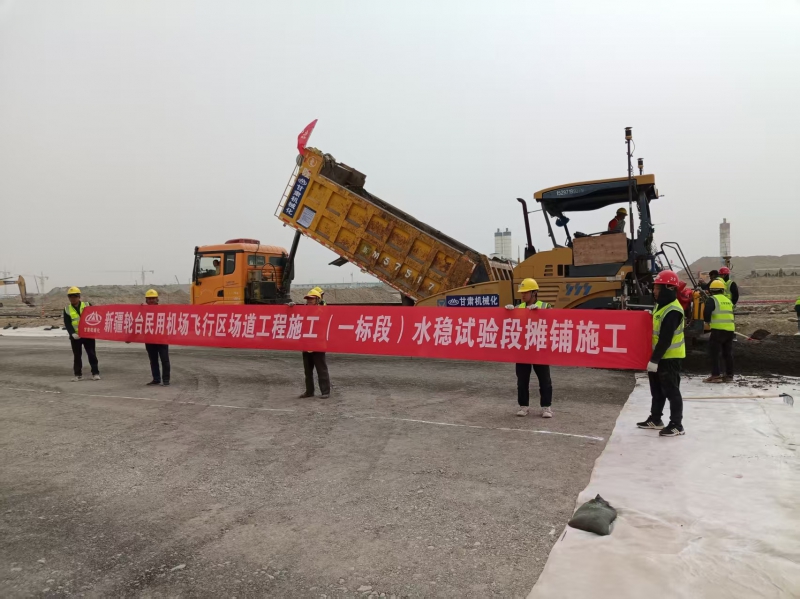3月27日,新疆輪臺(tái)民用機(jī)場(chǎng)項(xiàng)目現(xiàn)場(chǎng),隨著首車水泥穩(wěn)定砂礫混合料倒入攤鋪機(jī),其緩緩啟動(dòng),我司承建的該項(xiàng)目飛行區(qū)場(chǎng)道工程(一標(biāo)段)水穩(wěn)基層施工正式開啟。